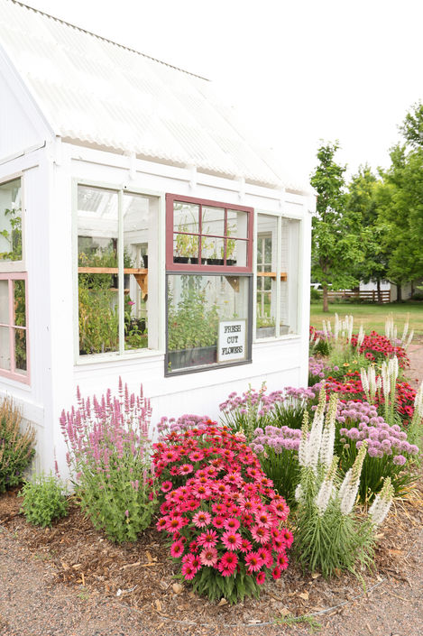 One of our first flower farm projects was building a small greenhouse for starting seeds and growing plants in the off-season. A big corner of our property sat empty and unattended for the first five years, and it seemed like the perfect space to create something beautiful. Over time, we collected beautiful antique windows from flea markets and salvage yards. The finishing touch was the solid wood door with etched glass that we found at a salvage yard.